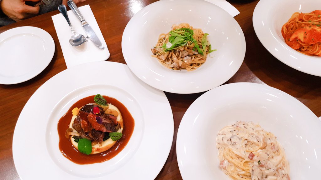 왼쪽이 '크림 소스의 베이컨, 버섯 스파게티(13,500)'