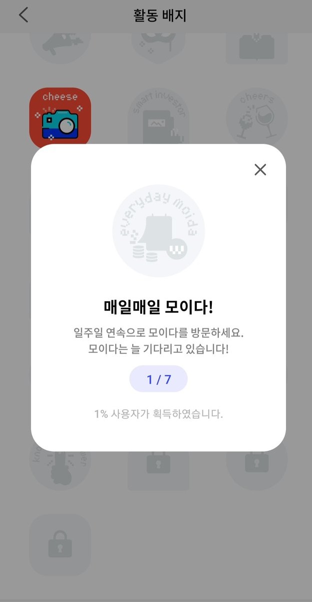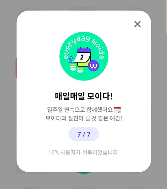 3. '매일 모이다'는 저 가운데 있는거 누르시면 출석체크되는데요... 7일을 해야 성공인것 같아요ㅠ0ㅠ