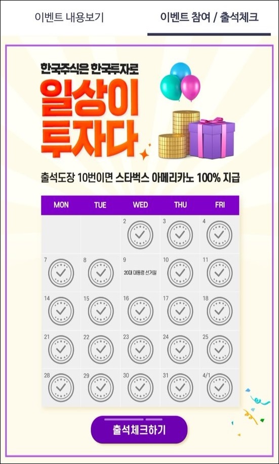 요약하자면 영업일 10일 출석체크 하면 스타벅스 쿠폰 준다고 합니다 ^^