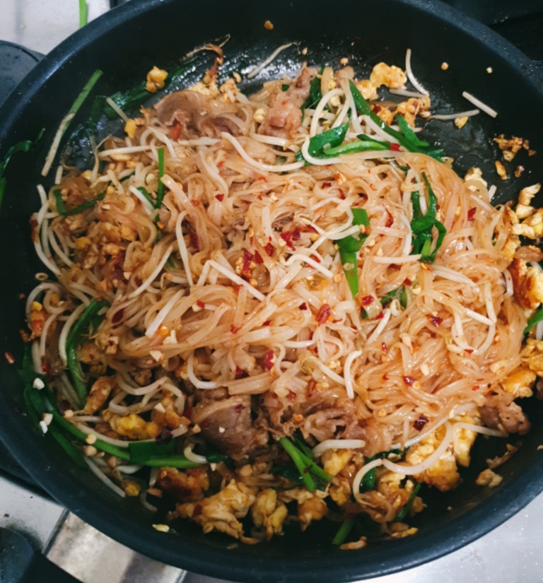 팟타이소스를 넣고 1분 볶고, 숙주와 부추를 넣어 1분 볶기