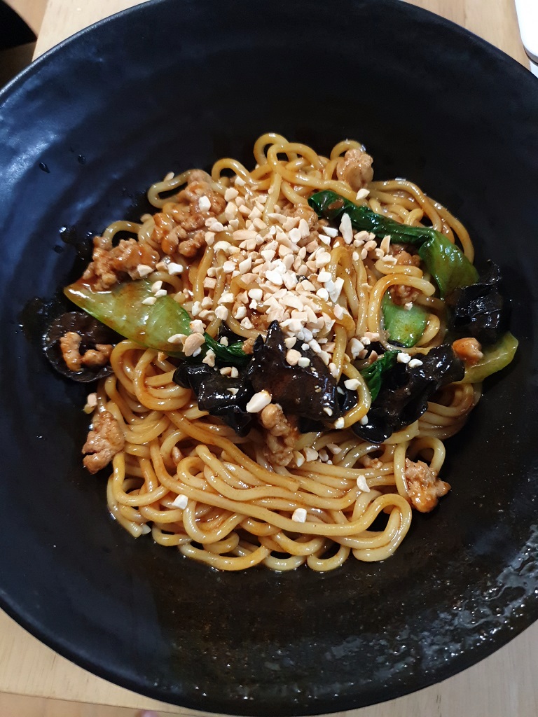- 그릇에 면과 소스 넣고 청경채, 돼지고기, 목이버섯, 땅콩분태 올려 완성~